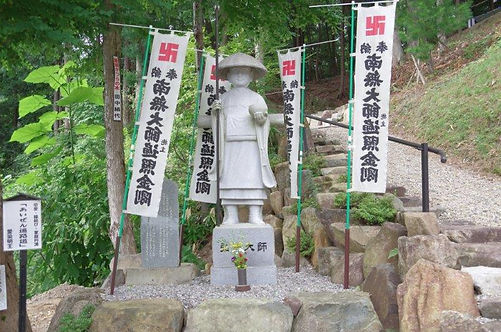 ぜひお大師さまに手を合わせて安全を祈願してからあいぜん遍路道の巡拝をしていただきたいと思います。近くに「同行二人(どうぎょうににん)」の杖もありますので使用してください。この杖はお大師さまそのものであり、一緒に歩むことで参拝者の安全を守ってくださるものとされています。